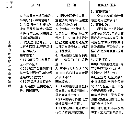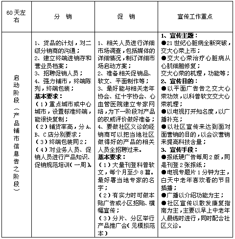一、营销思路 1、指导方针:社区(小区)、终端、电视、报纸、广播、 2、宣传目标: (1)解决消费者的认同问题,提升销量; (2)广泛宣传交大心荣治疗心脏病与众不同的两点: ·治疗心脏本身问题(心肌细胞损伤;心泵能力弱) ·从血管、血液部位出发,全面改善血液微循环。 (3)交大心荣配方独特、疗效明确。 3、市场策略: ※有实力及经验丰富的经销商,以中心城市为重点,辐射周边地区,集中攻打,重点突破,攻击点少而精、准而狠。 ※实力一般的经销商建议先攻打最能影响中心城市的地区城市,达到区域突破,包围并消化中心城市。 4、宣传策略: ※利用康复指南,展板等社区(义诊)宣传,配合一系列促销活动起到宣传产品,制造声势的作用。 ※重点宣传以交大心荣的机理,功效,科技含量为切入点,来说明交大心荣优于同类产品。 ※百年各校——西安交大出精品,疗效、服务有保证。 5、产品定位 (1)主治:心阳不振、气阴两虚型冠心病、心绞痛、心肌炎、心肌病及心肌缺血、缺氧、心肌损伤引起的各种心脏病,亦可用于慢性心力衰竭的治疗。 适应症:心肌缺血、心肌损伤、胸闷隐痛、心绞痛、心悸气短、心慌心跳、口唇发紫、头晕目眩、倦怠懒言、面色少华、心律失常、动脉硬化。 (2)卖点思路:人的心脏主要由心肌细胞组成,心肌损伤、心肌缺血、缺氧是引发各种心脏病的主要原因,各种心脏病又会加剧心肌损伤,导致缺血、缺氧状态。交大心荣修复受损心肌,增强心肌血流量,降低心肌耗氧量,增强心脏泵血功能,提高冠状动血流量,软化并扩张血管,降低血粘度,改善微循环。 (3)交大心荣作用机理: 心脏心肌方面:修复受损心肌,改善心肌营养、能量代谢,增强心肌舒缩力,提高心脏泵血功能,降低心肌耗氧量,改善心肌缺血、缺氧状态,提高心肌抗损伤能力,快速恢复心脏健康,从而治疗冠心病、心肌炎、心肌病。 冠状动脉血管方面:软化并扩张动脉血管,增加冠状动脉血流量,改善心肌微循环,保证心脏血流畅通。 血液方面:通过活血化瘀,气血双补,降低血浆脂质过氧化物(LPO),清除自由基,提高血液红细胞SOD酶活性,降低血脂及血液粘度,提高红细胞携氧能力,改善血液质量。 6、宣传手段: (1)、中心城市(重点城市)报纸广告(硬+软)+专题片(白天)+终端建设+会议型营销 (2)、非中心城市(一般地级城市)社区义诊推广+专题片(白天)+报纸广告(软为主)+终端建设 7、宣传要求; (1)、终端要求: ·以多取胜——品种、数量比别的产品多,气势比别的产品大; ·以实取胜——用不干胶粘住、贴牢(对不干胶一定要做到撕不掉,补充的频率大,一般的药店及小区每周观察2次,如有缺漏及时补充); ·以好取胜——印刷好,当地性强,张贴的位置好,组织的方式好; ·以情取胜——通过与营业员勾兑,与小区管理员勾兑,做到每一个终端营业员都成为自己的业务员。 (2)、组合要求: ※招贴、横幅配合正规的电视广告和报纸品牌广告及功能广告来营造市场氛围,让交大心荣的广告能看得到; ※专题带、康复指南和招贴让消费者能看懂交大心荣,使消费者信服我们的功能,从而产生购买力欲望; ※台卡、展板、堆头让消费者在购买时感觉到一种气氛的感染,社区义诊、终端能在瞬间看得见,直接产生购买行为。