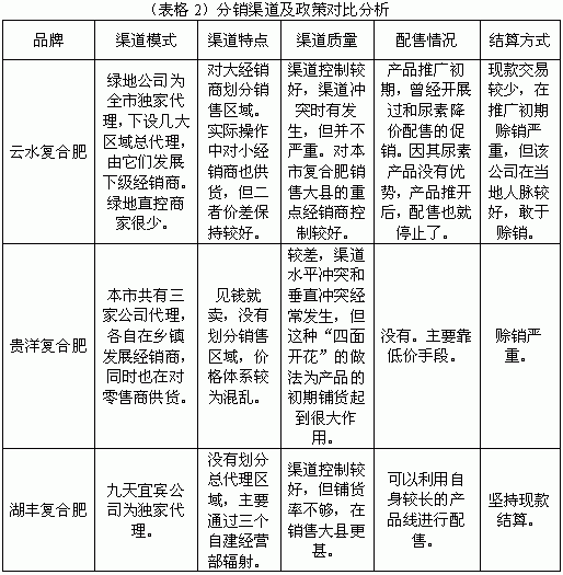 随后,洪经理还专门对本市的竞争对手进行了调研。绿地公司是九天宜宾的主要竞争对手,其经销的云水牌复合肥进入本市最早,也是销售最好的同类产品,去年销量在1000吨以上(约占全市复合肥销量的25%),湖丰的质量与云水不相上下,价格上略高30元左右,这主要是因为云水是四川省内产品,而湖丰是省外产品,湖丰运距较远,物流成本较高。洪经理得出结论:湖丰是一个具有市场竞争力的产品。 那么症结究竟在哪里呢? 为了更深入分析,洪经理将湖丰和主要竞品的渠道政策做了对比,并发现各自有着以下差异(见表格2):