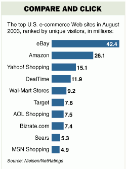 市场研究公司Nielsen/NetRatings称,雅虎仅次于eBay和亚马逊,是美国访问量排名第三的综合商务网站。但雅虎与亚马逊之间的差距很大:亚马逊8月份的访问量有2,610万人次;而雅虎购物频道只有1,510万人次。一些专业购物网站,如DealTime的访问量有1,190万人次,并不比雅虎差多少。DealTime昨天更名为Shopping.com。