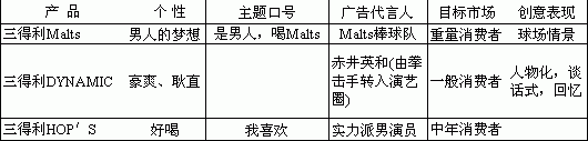 “三得利”与电通合作,以正规的战略和创新的智慧,在中国本土缔造了啤酒营销家庭市场佳绩。本土广告公司并非缺乏出奇之招,却常常“虎头蛇尾”。我们少了些什么? 三得利(Suntory)是一个原创于日本的历史悠久的著名品牌。在日本市场三得利啤酒主要有三款产品,它们分别针对不同的目标市场,配合相应的沟通战略。见下表。