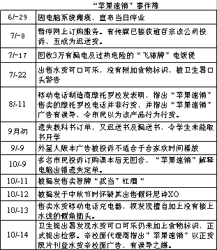 二、困境 面对“苹果速销”的低价扫荡,百佳、惠康两大超市不仅在价格上同步下调,直销服务上也亦步亦趋。8月6日,百佳更是率先推出“至低地位,无可替代”减价大行动,将近千种商品的价钱减至最低(如西瓜1元1磅,可乐1.5元1罐)。惠康亦不甘示弱,两大超市大多数商品的价格已低于“苹果速销”。百佳还免去10元的送货服务费,同样以150元为供货值下限,推出电话、传真、上网、报上购物易、ShopNDrop等多种直销服务形式。惠康也将所有来自电话、传真、互联网和互动电视的订购要求,集中于一个货仓管理,加强了自身直销服务。至于电器零售商和电脑代理,丰泽电器推出2000元以下电器直销,电脑生产商Compaq则推出38000元的电脑迎战。结果,“苹果速销”的营业额马上就下跌了1/3(从日均75万港元跌至50万港元),而两大超市则连日来挤得水泄不通。不仅如此,两超市集团还向一些代理明示:倘若向“苹果速销”供应商品,超市将不会把这些商品放上货架。 另一方面,从一进入市场,“苹果速销”就出现一系列问题并被媒体曝光(见下表),令消费者信心大失,企业声誉一落千丈。至10月份,累计亏损已超过2亿港元。