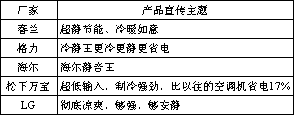 一、推出新一代产品“迷你星” 虽然“905”系列空调产品性能十分优良,但在其他方面存在问题,如产品缺乏特色。“905”系列的主要优点表现在制冷强、耗电省、噪音低等几方面,在产品推广和宣传上也是围绕着这个主题,而当时中国其他的几个主要空调厂家无论在技术改进还是产品推广上也都围绕这几方面做文章。 1997年各主要厂家主要产品的宣传主题