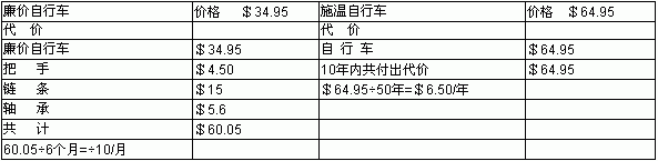 推销员接着对顾客说: “好了,顾客先生,事情很清楚,便宜的自行车价格要低得多( 34.95对64.95),而代价却差得很多(一年6.5对一个月 10.00)。因此,顾客先生,我可以再问一下,你关心的是价格,还是代价呢?价格是一次性的,代价则是你取得这个产品以后所一直要关心的问题。有些产品可以在价格上战胜我们,但要说到代价,赢家却是我们。由于你关心的是代价,你还有什么理由不立即坐享最低代价的益处呢?”