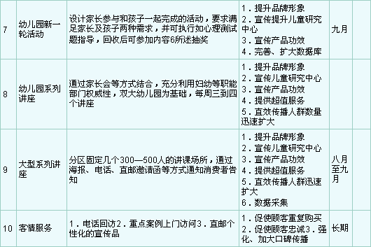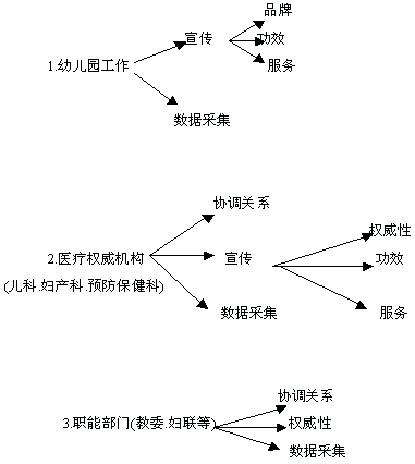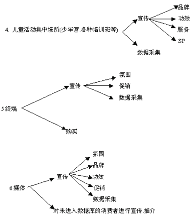 3.架构简述: 通过幼儿园.妇幼等初步建立数据库,充分使用直复营销中的电话.直邮.讲座等方法为消费者提供关系营销.服务营销的基本内容,并相对准确的选择媒体及运用广告策略向消费者传达信息和促销,同时可进一步完善数据库.消费者在产生购买行为时运用传统通路售出,使之最便捷的得到产品,并使产出最大化,这里面整个是互动的一个过程,在不同的阶段根据公司的各种资源和目标要求不同侧重点不一样. (二)、阶段操作简述 A.基本方法及目的