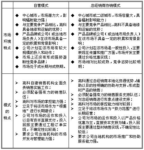 在传统的通路模式中,企业考虑的主要因素有:厂家,各种规模的塑料型材生产企业;组装厂,各类塑钢门窗加工厂和安装队;用户,房地产开发商及单位工程、个人2类用户。型材生产厂家先是直接跑工程用户,等拿到工程方的进货合同之后,再由工程方出面与组装厂联系,让组装厂购买生产厂家的型材,最后由组装厂完成型材的加工和最终成品门窗的安装。这样做的直接后果是,型材生产厂家与组装厂不能形成紧密的协作关系,而只是松散的供货关系,因而最终提供给消费者的成品门窗质量也就往往难以保证,因为型材的生产、加工和门窗的安装三个环节是完全脱节的,无法进行有效的质量的监控。这种现状不仅给消费者利益的实现和保障带来严重的危胁,也促成建材行业的无序竞争,这便形成了建材市场和门窗型市场的巨大黑洞。 二、新生的高科塑业 经过对塑钢行业的营销通路模式的考察诊断,我们整理出高科塑业营销通路模式发展的三个阶段: 起航——高科塑业营销通路模式创新的第一阶段 时间:2002、4——2002、6 目的:对高科塑业现有通路模式的考察和总结,确立企业通路建设模式的发展战略,为企业实施新的通路模式提供数据、观念上的支持。 高科塑业现有通路模式的总结:经过对高科塑业省外市场销售资料和信息的深入研究和分析,青禾企划总结提出两种省外型材销售模式:自营模式和总经销商模式。下面就这两种模式在现实工作中的运用和特点进行一个全面的分析与比较: