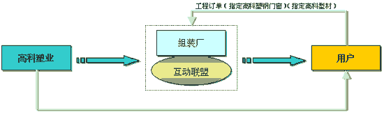 互动联盟模式的实质:由单纯的型材生产厂,成为以型材销售为主,同时拥有和经营塑钢门窗的品牌,对门窗的加工、安装和服务进行掌控,形成型材和门窗产品的组合销售。从而实现“型材生产——门窗加工——安装到位”三位一体的营销模式,杜绝了门窗在生产、加工、安装和销售环节上可能出现的任何纰漏得到杜绝,让消费者一步到位地用上100%的优质门窗。在明确了“互动联盟体”的运作模式之后,高科塑业便可以组建起自己的新营销通路模式。 新营销通路模式: