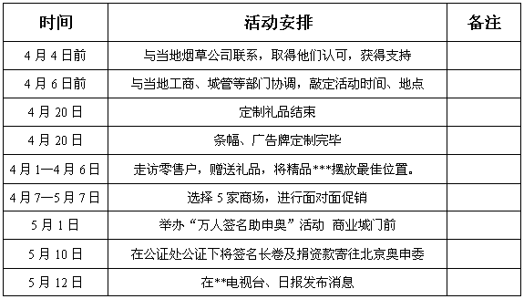 第一部分:背景介绍 近年来,卷烟市场竞争日趋激烈,就江苏省内市场而言,南京、淮安、徐州三家烟厂各占有部分市场份额,其中南京、淮安烟厂以其特有的营销模式和策略占据了大部分市场份额,但就江苏省200多万箱卷烟的需求量与三家烟厂100万箱生产能力相比,市场空间极大,地产烟还是可以在江苏卷烟市场再创一个新高峰。 自北京申奥以来,各项活动此起彼伏,在全国范围内掀起了一股股热浪。到7月份宣布结果为止,还有100多天,目前正值北京申奥的关键时期,通过北京申办奥运,不仅有利于北京自身,还有利于促进全国人民的团结和国家经济的总体发展。故我们可以在申奥期间举办各类支持申奥的活动,来推动卷烟品牌的发展。 第二部分:总体思路 1、活动目的: 此次促销活动,紧密围绕“申奥”主题,开展一系列活动,以提高“***”品牌的知名度和美誉度,至扩大销量。 2、宣传口号定位: 本次宣传活动以“北京申奥、有我一个”、“****鼎立支持申奥”为宣传重点。 3、重点宣传产品: *******(零售价80元/条), (因前期*****投放后势头不错,而且今年****的上量对我厂调整产品结构起着至关重要的作用)。 4、成立宣传促销领导小组: 为确保此次促销活动的圆满完成,拟以**烟草专卖局(分公司)、**卷烟厂销售公司等部门为主体的宣传促销领导小组: 活动总指挥: 副 总 指 挥: 组 员: 促 销 人 员:卷烟厂促销队 5、宣传促销时间: 4月1 日 ———— 5月10日。 6、宣传促销地点:**市 第四部分 时间安排表