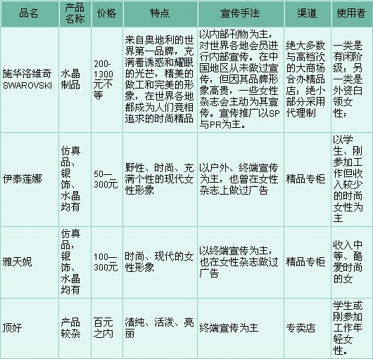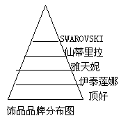 市场分析,为我们指出了一条品牌塑造之路 从我们提供的市场分析可以看出在大陆饰品市场,可以分成高、中、低档,以SWAROVSKI为代表的高档产品站在金字塔顶尖,光芒四射,消费主力也是高收入人群;以伊莲娜、雅天妮为代表的是中档产品,她们覆盖的人群较广,但由于缺乏一致广泛的形象宣传,反而拥有一批不固定的顾客,稍高端的产品会被SWAROVSKI的低端产品抢去市场,低端产品会被以顶好为代表的流行但廉价的饰品店抢收去生意,而在SWAROVSKI与伊泰莲娜间是一个真空地带,这一地带,则可被仙蒂里拉弥补。