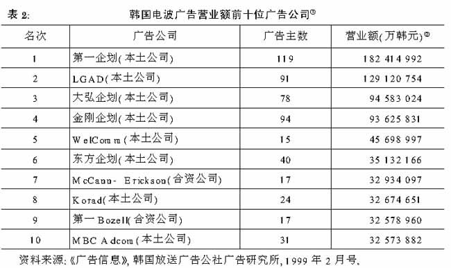 在开放的广告市场格局中,韩国本土广告公司显示出其绝对的强势。在韩国放送广告公社登记的197家广告公司中,外国广告公司只有9家。本土广告公司占全部广告市场份额的95%,而前20家广告公司的市场份额为783%,前十家广告公司的市场份额为579%。虽然1998年由于受经济危机的影响,韩国的广告业大幅度滑坡,但韩国本土广告公司仍然显示出其强大的实力。1998年电波广告营业额前十名广告公司中本土广告公司有8家,外国广告公司只有2家,其中前6名都是本土广告公司(详见表2)。