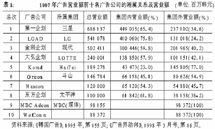 在开放条件下,韩国本土广告公司为什么能占据主导地位呢?在这个问题上值得我们注意的有以下几点: 1集团所属的广告公司主导广告市场 韩国广告公司的一个重要特点是集团所属的广告公司(In-HouseAdvertisingAgency)占据主要地位。从70年代开始各大集团纷纷建立集团所属广告公司,如1973年成立的第一企划是三星集团所属的广告公司;1984年成立的LGAD是乐喜金星(LG集团公司前身)所属的广告公司;1982年成立的大弘企划是LOTTE集团(韩国有名的流通集团公司)所属的广告公司;1983年现代集团也建立金刚企划。目前,在197家广告公司中集团所属的广告公司有59家,30%的集团所属的广告公司其营业额占全部广告业额的74.5%,其中的20家集团所属的大广告公司占据了68.8%的市场份额。不仅如此,大部分集团所属的广告公司其广告营业额的50%以上来自于集团内其他公司,而在韩国这些集团内公司一般都是实力最强的广告主,如三星电子、LG化学、LOTTE制果、太平洋化学(化妆品公司)、SKTelecom(电讯公司)、现代汽车等都是韩国最大的广告主。因此,集团所属广告公司几乎支配着韩国的广告市场(详见表3)。