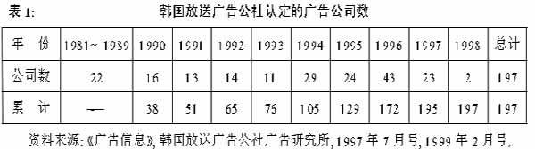在开放的市场经济发展过程中,广告市场的开放问题是无论哪个国家都要面临的问题。韩国从80 年代后半期开始开放本国的广告市场,外国一些著名的跨国广告公司纷纷进军韩国,加剧了争夺广告市场的竞争。但在开放条件下,韩国本土广告公司一直能占据绝对优势。本文从韩国本土广告公司发展的特点入手,论述了韩国本土广告对我国本土广告公司的发展的启示。 在开放的市场经济发展过程中,广告市场的开放问题是无论哪个国家都要面临的问题。韩国从80年代后半期开始开放本国的广告市场,外国一些著名的跨国广告公司纷纷进军韩国,加剧了争夺广告市场的竞争。但在开放条件下,韩国本土广告公司一直能占据绝对优势。那么,在开放条件下韩国本土广告公司为什么能占据主导地位呢?这对我国本土广告公司的发展有哪些启示呢? 一、韩国本土广告公司发展的特点 广告公司是广告产业发展的主力军。韩国现代意义上的第一家广告代理公司是1967年建立的合同通讯广告企划室(Oricom的前身)。但60、70年代韩国广告产业规模不大,加上还没有推行广告代理制度,广告公司的发展比较混乱。到1981年韩国才开始实行广告代理制度,当年韩国放送广告公社认定的广告公司只有4家,而1998年由韩国放送广告公社①认定的广告公司已发展到197家。可见,韩国广告公司起步较晚,但发展较快(详见表1)。