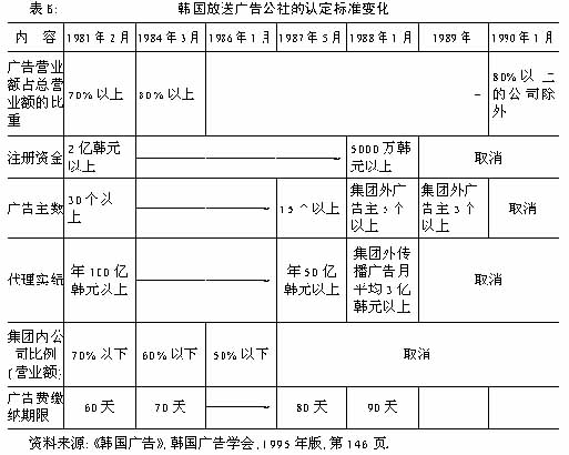 值得注意的是,韩国是在本土广告公司已经成熟的情况下开放广告市场的。80年代末和90年代初韩国的广告产业已具相当的规模。1988年广告费占GDP的比重已达1.01%,1991年为1.13%。另外,80年代末和90年代初,象第一企划、LGAD、金刚企划、大弘企划等韩国大广告公司已经相当成熟。第一企划早在80年代末已进入世界前30家最大广告公司行列。这些大广告公司一般都是大集团所属的广告公司,所以国内大广告主的广告业务一般由自己属下的广告公司来承担,而外国广告公司就很难找到韩国的大广告主。这是外国广告公司在韩国不能迅速发展的一个主要原因。 另外,在开放广告市场的时候,韩国学术界和广告界比较深入地讨论开放广告市场可能引起的后果。如广告市场的开放对本土广告公司的影响,外国广告、外国广告主和外国广告公司对韩国社会文化价值的影响。因为广告毕竟是与文化密切相关的。在开放条件下,外国广告公司会通过广告传播西方文化。这对重视传统文化的韩国来说是必须谨慎对待的问题。韩国先后共花了六年的时间才完全开放广告市场。 3推行独特的广告代理制度 在韩国广告市场上,本土广告公司特别是集团所属的广告公司始终占据主导地位,这与韩国推行独特的广告代理制度有关。韩国的广告代理制度是从1981年建立韩国放送广告公社以后开始推行的。1981年根据《韩国放送广告公司法》建立了韩国放送广告公社。要做电波广告的广告公司只有通过放送广告公社的认定以后才能购买电波媒体的广告时间。而广告主向媒体交广告费,媒体又把20%的广告费分给放送广告公社,广告公社把其中的一部分作为代理费转交给广告公司,另一部分根据有关法律和政策用于广告事业的发展。所以,韩国的广告代理运作方式比较独特。 放送广告公社的认定条件是比较苛刻的。放送广告公社在1981年颁布的《关于广告公司代理电波广告的规则》中规定,注册资金2亿韩元以上、拥有30个以上的广告主、年广告营业额达100亿韩元(其中电波广告营业额50亿韩元)以上的广告公司才能获得资格认定做电波广告。在这样苛刻的条件下,只有实力雄厚并能保证广告主客源的大广告公司才可能获得资格认定,而大集团公司一方面拥有雄厚的财力,另一方面本身就是大广告主。后来,韩国政府逐步放宽广告公司资格的认定条件,特别是到1994年改认定制为登记制(详见表5)。