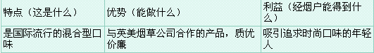 此文为本文作者在给国内某大型烟草企业进行“业代”培训时,做的《发现客户需求》等销售技巧的培训 发现客户需要 “只有满足了客户的需求,才能带来销售机会!!!” 1. 发现经烟户需求的方法:提问和聆听 2. 提问、聆听的好处 ·保持清晰的思路 ·让经烟户更易于接受你 ·获得更全面的信息 ·更有效地和经烟户交流 ·更清楚地理解经烟户的情形,环境和需求,增强销售的信心 3. 提问的方式—开放式和限制式问题 ·开放式问题 让对方畅所欲言,以免你作出不正确的假设。 开始时的问题—发掘经烟户的需要 帮助你进一步了解经烟户需要的问题 鼓励经烟户谈多一些,或作不同回答 ·限制式问题 确定你和经烟户对同一事情都有清楚的了解。 4. 积极地聆听 一种和提问共同使用的技巧就是聆听。提问是为了发现经烟户的需求,而聆听可以帮助你辨别需求和机会。 5. 聆听的障碍 ·障碍一 对经烟户的问题或话语反应太快。 为了给经烟户留下好印象,冲击队员对经烟户的问题或话语反应太快。 ·障碍二 当经烟户还在说话时,你脑子里在想着如何回答他的问题。 即使你没有打断经烟户的话,你仍要小心不要因经烟户谈话中的一些细节分心,而忽略了总体或更重要的信息。 推荐重点牌号 冲击队员应该非常清楚此次冲击的重点牌号,按照芜烟销售策略,迎客松是中高档的品牌,重点是“金牌松”、“绿松”、“吉品松”,所以每个冲击队员必须非常熟悉他们的零售价格、产品特征、优点,与竞争品牌的差异;这样才能更好地达成冲击的目的。 1. 何为“特、优、利”分析 “特点-优势-利益”(特优利)是推销表述的一种方法,能够将我们产品的特点和优势与经烟户的需要联系起来。这也是一个机会,使你能够进一步提高经烟户的关注程度,从而取得承诺。特优利的使用要求你具备相关内容的详细了解。 特点 例如: 焦油含量低;口味醇和;是混合型香烟 优势 例如: …… 利益 例如: …… 有很多方法可以展示特点、优势和利益,比如事实、例子、类比、引述、数据等等。最有意义的特点,加上相应的利益,反映了我们产品的竞争力。比如你可以比较一下“迎客松”品牌在国内的知名度。你应该对将要拜访的经烟户进行充分准备,找到适合他的特优利分析。记住一定要将利益和特点、优势一起介绍,否则经烟户会说:“那又怎样?”同样,如果你只强调利益,经烟户又会说:“你怎么知道?” 比如都宝(烟草品牌)“特优利”分析: