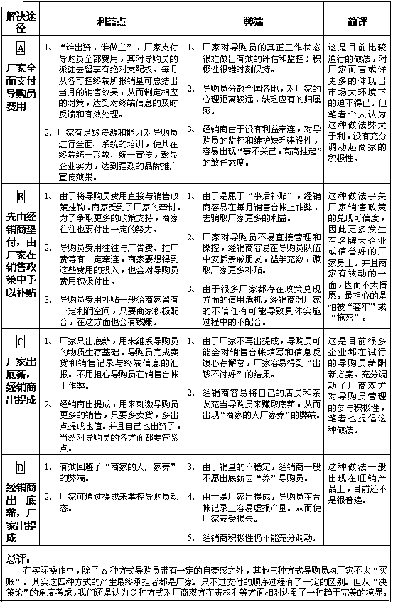 随着各传统行业产能的不断增强,整个市场呈现一种“粥(产品)多僧(消费者)少”的“倒挂局面”。于是“掌控终端,决胜终端”便成了几乎每个生产厂家的营销指导思想。因此,在这种“大终端”思想的直接指引下,终端环节形成了一种“需求内压”,于是,导购员这一特别群体便应运而生了。 较之计划经济时代的营业员和柜台小姐,今天的导购员对产品的形象展示和宣传推广具有空前的主动性。他们无论在终端卖场形象展示方面还是对顾客服务的加强等方面都是功不可没的。的确,在零售市场竞争日益激烈的今天,缺乏导购员维护的零售终端,其无论是展示形象还是最为重要的销售效果都会大打折扣。导购员的重要性不言而喻,但在由谁派驻的问题上,至今还没有一个切实可行、让厂商之间达到共赢的办法。 许多人会很自然地认为,既然是厂家要“决胜终端”,那么导购员就理应由厂家来派。殊不知,派驻导购员所产生的高额费用也会使许多厂家苦不堪言,其中最为明显的莫过于如下一对矛盾: 1、本来行业竞争形势就日益严峻,使得利润率逐渐降低,而相反渠道费用却在看涨。就零售终端而言,许多零售商场趁机向厂家收取导购员入场费、培训费、管理费、工装费、工牌费等苛捐杂费,使得厂家雪上加霜。我们不妨按导购员平均月薪650元计算,如果在全国范围内拥有300个可控零售网点(派驻有导购员的零售网点),那么每月即要支付导购员费用20余万元。再加上上述苛捐杂费的报销等等,确实够人“吃一壶”的。而在这些费用当中,除非是旺季销量的急剧飙升,在正常零售过程中一般至少有2/3是导购员的底薪,也就是说,每月约有10多万元是用来维系“厂家与导购员的雇佣关系”的。 2、但在同时,不派驻导购员又不行。特别是一些品牌拉力不大的中小品牌,若没有导购员的奋力推介,且不说其终端销量会受影响,单其终端的展示形象也很可能会一塌糊涂。笔者曾多次走访终端卖场,就发现有导购员的卖场展柜清洁、样机整齐、单张有序、海报醒目,而没有导购员的卖场大多杂乱不堪。并且,由于缺乏对产品选购的有力指引,顾客往往在展位前稍事驻足便被其他品牌的导购员“盛情相邀过去”。 让事情变得更为棘手的是:由于商场的地域性以及导购员的工作性质,使导购员的工资发放者(厂家)与管理者(商家)的不统一引发出了如下一对矛盾: 1、导购员遍布全国各地,由于文化素质、地域差异等客观因素致使很难对其进行全面、统一、系统的管理和信息反馈。即便是细化到分公司或办事处负责管理,由于有许多业务员也是外地人,从而使总部及分公司对终端信息和销售效果的操控性也会显得“鞭长莫及”。 2、而在另一方面,由于导购员往往与当地代理经销商同属“本地人”,生活习惯的相近带来了沟通上的便利,再加上日常的产品出样和货源补充等业务联络,从而致使导购员纵然在心理上愿意“归顺”厂家(尤其是对人说起自己是厂家导购员时,比商家导购员要更为自豪),但在日常工作中,却时时与经销商保持着更为紧密的联系。 归根结底,导购员由谁派的问题就是由谁支付薪水的问题,而支付薪水一方的直接效果就是对导购员的日常工作管理的参与性、积极性和支配性都大大增强。针对当前的市场环境,许多厂家与代理商之间通过协商在导购员派驻问题上达成了一致,目前比较通行的解决途径不外乎如下四种,下面笔者就逐一分析其利弊所在: