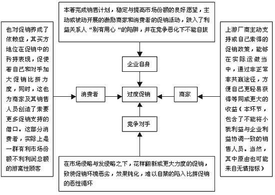 为了便于理解,在进入正文之前,有必要先对“过度促销”进行概念阐释。所谓的“过度促销”指的就是:促使行业市场的竞争更加恶化,促使促销效力进一步钝化,促使投入产出比愈加不成比例,并导致渠道成员等企业利益关系人的行动,与企业促销愿望背道而驰的一切促销行为。 从这可以看出,过度促销是有其明显的特征和深刻的成因的。 过度促销的特征性成因 纵观众多过度促销,其特征往往都与其成因呈胶着状态,很难分开而谈。 其一,除了一些晋升、荣誉及精神上的激励之外,大多数促销作为,都是企业在以牺牲当前赢利能力,换取更大(或稳定)市场份额、更大(或稳定)销售量及利润总额的愿望下得以开展的。也就是说,多数促销作为,它最终都能转换成货币,它都是嵌入价格基础上的行为。只是,其中有直接与间接之分。 直接的如,降价、折扣;间接的如,针对商家的进货赠量、物质奖励、旅游及学习机会的奖励、针对消费者的买赠;等等。 其二,从上可以看出,促销的一大特征就是功利性极强。既然如此,它肯定会影响及损伤竞争者的利益。出于维护乃至扩大自己利益的目的,多数对手自然会以相近甚至是幅度远大于自己手笔的促销,进行抗击。这就使得市场竞争过激,促销及企业生存、发展环境进一步恶化。 其三,在环境恶化、竞争激烈的市场中,大多需要有所举措才能站住脚和维护住自己的既得利益,这又使得上游厂商的销售部门及人员、各级分销商、终端商逐渐养成了对促销的过度依赖;与此同时,深受众多促销活动教育的消费者,又开始捂着腰包期待着促销活动开展下的好处,促销开始了,许多人又开始观望,是否还有能带来更大好处的促销开展。甚至又有人开始置疑厂商的利润、促销背后的产品质量及服务。 其四,倍受促销洗礼的消费者,一旦和中上游渠道成员一起都养成了促销依赖症,就自然不会轻易为促销所动。如此,促销效果钝化势成必然。 其五,在促销效果钝化之下,多数企业就只有在后两个途径中择其一了。即:要吗增加促销力度,要吗创新。可是比较容易的创新对手都做了,自己如要在其它方面进行突破,风险似乎又难以凭经验判断和把握。这又造成了促销难(总经理当众喝涂料,美女大街上演洗澡秀等怪诞式促销也是创新难的表现之一)。 其六,除了上述种种之外,渠道中上游成员的“私心”泛滥,也是造成过度促销的一大成因及特征。 如某区域市场,由于铺货等营销基础工作做得不扎实,但是销售人员却以刚进入该市场,消费者接受度不够;竞争品牌过度集中等为借口,向企业索要过多促销支持。如某分销商在扣点返例、进货赠量等上面,本来是享受企业统一的促销支持的,但面对急需完成销量及回款指标的销售人员,趁火打劫,索要更优厚的促销政策。政策一旦到位,便为了获取更优厚的扣点返利,采取窜货、低价倾销等方式冲量。等等。 从上述可以看出,过度促销的致使人几乎涵括了所有的市场主体。这正如下图所示,其中既有来自企业内部的,也有来自渠道成员的,还有来自行业市场中的竞争对手的。而且,有些因素也是一家企业凭一己之力所克服和避免不了的。在本文中,主要将以企业可控因素为核心谈起。