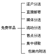 •额外包装,即在包装内额外增加份量而无偿赠予。 •包装内赠,即将赠品放入包装内无偿提供给消费者。 •包装外赠,即将赠品捆绑或附着在包装上无偿提供给消费者。 •功能包装,即包装具有双重以上使用价值,不但可以做包装物,还可另做它用。 所谓“免费样品”指的是将产品直接提供给目标对象试用而不予取偿。 实施“免费样品”促销,最主要的问题在于如何将样品分送到目标顾客手中。其分送的方式一般有八种: