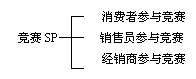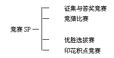 ·征集与答奖竞赛,即竞赛的发动者通过征集活动或有奖问答活动吸引消费者参与的一种促销方式。促销竞赛,是才华加参与并获得消费利益的活动。最终竞赛的成功获得者,必是在比赛中的姣姣者。如广告语征集、商标设计征集、作文竞赛、译名竞赛等。 ·竞猜比赛,即竞赛的发动者通过举办对某一结局的竞猜以吸引顾客参与的一种促销方式。如猜谜、体育获胜竞猜、自然现象竞猜、揭迷竞猜等。 ·优胜选拔比赛,即竞赛的发动者通过举办某一形式的比赛,吸引爱好者参与,最后选拔出优胜者的促销方式。如选美比赛、健美大赛、选星大赛、形象代言人选拔赛及饮酒大赛等。 ·印花积点竞赛,即竞赛的发动者指定在某一时间内,目标顾客通过收集产品印花,在达到一定数量时可兑换赠品的促销方式。印花积点是一种古老而具影响力的促销术。只要顾客握有一定量的凭证(即印花:商标、标贴、瓶盖、印券、票证、包装物等),即可依印花量多少领取不同的赠品或奖赏。 竞赛SP的参与对象主要有三个,促销竞赛的发动者应根据需要选定目标顾客参与。