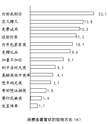 但是,我们也发现,有些SP是不便于有机组合的,如无偿SP与折价SP,两者存在着一定的矛盾,在促销时就不能强扭在一起。因此,在我们运用组合SP时,应选择不同方式进行合理的配置。或者,在不同的阶段分开使用SP,使促销更具有延续性和递进性。 例如,美国通用制粉公司(General MillS)新推出的一种脆麦片加葡萄干的食品,为了打开销路采用一种有效的SP组合。首先他们使用“免费样品”通过直邮方式寄送给广大消费者,并且在1.5盎司包装的样品内再附上一张7美分的折价优惠券。这样,当消费者吃到样品并满意后,马上拿着优惠券就可以到附近的商店内再去购买。事实证明,这一套促销“组合拳”在市场上十分成功。 综上所述,市场锋线的促销方式各有所长,不拘一格。随着市场的竞争加剧,技术的日益更新,创意的灵活展现,还会有更多的促销方式不断涌现。我们要于此再次强调的是,市场侵略之战略,早晚会表现到市场的锋线上,因此,市场主体在锋线的竞争,关系到企业的生死存亡。 下面是北京智生堂营销顾问有限公司在1998年所做的促销方式的喜爱度调查,在此以供竞争促销参考。