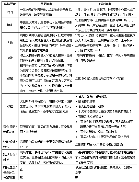 所谓名品,可以是一个著名的品牌,也可以是一个名企,名企不仅有自己的核心品牌,更有自己的核心技术和核心产品。所谓名人,当然指具有较高知名度甚至较大社会影响力的正面人物。所谓名店,是指具有巨大影响力的流通渠道,他的品牌知名度、美誉度、市场占有率均高于其它流通渠道。所谓创新“广场秀”,一般来讲是指企业的大型户外公众活动或主题宣传活动的基础上引入创新元素。 四、力求踏稳第一步: 那么,第一步的工作是如何提炼创新性传播策略呢?为此,我展开了如下思考: 1、电业是一个高度市场化的行业,各厂家的传播资源均较多,本公司在这方面并无优势,单纯的拼广告投入,必然事倍功半; 2、消费者的个性化需求越来越来多,再也不是“振臂一呼,应者云集”,“全国山河一片红”的时代; 3、传播手段、传播渠道越来越多,没有一种媒介能一统天下,笑傲江湖; 4、本公司是一个名企,社会关系网上有其优势,新任营销及公关副总裁Q先生是业界知名人士,香港著名作家兼职实业家L博士和本公司有着长期的良好的合作关系,并且他们都在商业领域具备一定的号召力。这些均是值得我们利用的社会资源; 5、商业流通渠道(名店),特别是专业家电连锁影响力越来越大,如果厂商联合推荐势必传播效果显著且能减少渠道进入成本; 6、传播上只有新闻效应的宣传成本最少、宣传效果最好且社会关注度最高; 7、老百姓难得和名人“零距离”,可否安排广场秀(户外公众活动),和名人“第一次亲密接触”?但为避免大型户外公众活动程式化严重的现象,取得低投入高回报的效果,一定要引入更多创新要素。 根据以上七点,我得出结论(完成第一步的工作):以“名品+名人+名店+广场秀”的传播策略进行公关活动,制造新闻效应。形成的初步思路是利用公司的品牌和良好的社会资源优势来吸引、融入名人,将品牌和名人捆绑,再利用名人和名品的捆绑优势吸引、融入名店,通过引入其它的创新要素将名品、名人、名店三者的整合优势充分发挥,营造创新“广场秀”,产生强大的新闻传播效果,这样就能突出的体现公司的品牌定位,达到轰动有效地宣传名品的目的,最终实现企业的低投入高产出。具体到本公司就是:利用本公司的品牌优势和营销副总裁Q先生的个人影响来邀请香港著名作家兼实业家L博士;再利用本公司、Q副总裁和L博士的名誉去邀请全国各大经销商共同参加“广场秀”;在“广场秀”当中,在传统的大型户外公众活动的基础上又成功的引入名人演说(从消费者的角度,从厂商联合的角度)、签名赠书、企业百人宣誓、全国十大主要名店联合推荐仪式等要素。确保整体效果的轰动效应。 五、实施:有条不紊 接下来第二步的工作,就是制定严密的组织实施计划,确保创新性传播策略(集名品、名人、名店为一体的创新广场秀)能得以不折不扣的执行到位。根据本人多年的大型公众活动经验,我把大型公众活动(广场秀)的系统思维高度总结为十一个要素:时间、地点、人物、接待、议题、议程、媒介策略/新闻发布会、物料设计/制作、现场布置/维护、时间进度/任务分工表、预算明细。其中最见策划者功力的是议题与议程的设计。它是整个大型主题活动的精华所在。策划者本人的功力也由此分出境界。根据第一步的创意策略,我主持的本大型户外公众活动按十三要素展开如下:(以下仅对十三要素的展开进行结论性及因果性的简要描述)