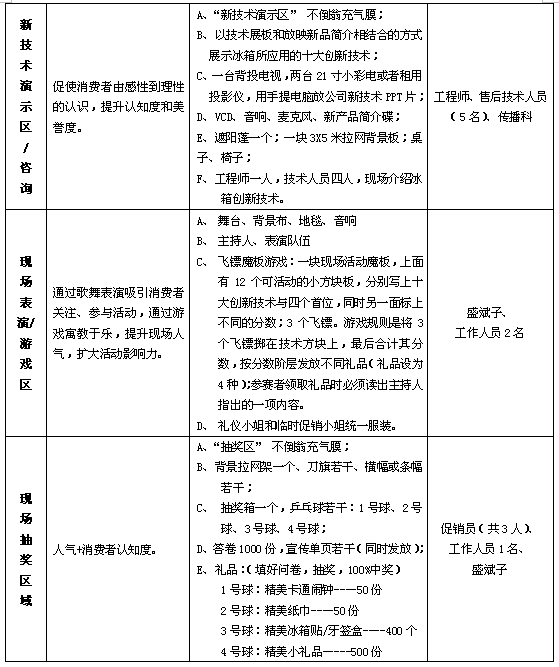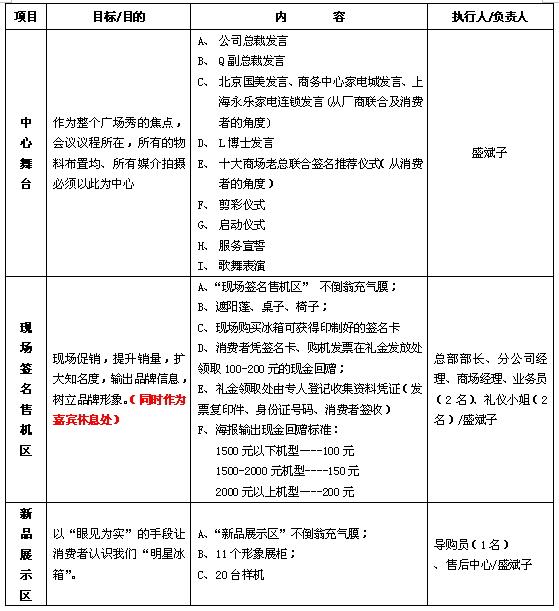 组织实施计划明确之后,接下来第三步的重点工作就是如何说服并保障计划实施前的各重点要素全部到位。 2001年4月,我把上述思路直接同Q副总裁进行沟通,他欣然应允,并对整个方案作了详细问询和局部建议。 4月初,按计划印制了一批邀请函,特别强调了会议议程安排及会议主题介绍及商务论坛的性质,因为只有这些综合因素才是吸引名人、名品的充分条件。当以本公司和Q副总裁的名义下函L博士并向其陈述本方案的要领时,L博士表现出了高度的兴趣,答应百忙之中参与7月在广州和上海的启动仪式并且愿意从一个普通消费者的角度和一个家庭主妇的角度阐述她本人用本品牌冰箱的体会。可以说,在此之前,没有哪一个企业请名人一文不花而让其心甘情愿为企业作准户外商业推荐而且是从一个普通消费者的角度的。作为本次广场秀活动的精彩之处,我在方案中除了安排L博士演说之外,还特地为其安排了买冰箱签名赠书活动。并在现场的物料上突出L博士的个人形象及其下属的××影视制作公司。在得到L博士的肯定回答之后,5月初我们便以本公司、Q副总裁及L博士的名义下函各家电经营巨头。这些家电经营巨头如北京国美、北京王府井百货、上海永乐、上海商务中心家电城、广州新大新、广百、江苏苏宁、山东三联等全国前几十家商场均欣然答应参加在北京、上海、广州举行的“全国500家大型商场联合推荐××冰箱”市场启动仪式。为了增加对这些经销商的吸引力,我们还每人送营销管理书籍及L博士大作各一套。 为了保障活动当天的人气,增加社会影响力,我们除力邀全国各大主要媒体之外,还在邀请函的回执上注明要求各商业同仁手写上一句有关本次会议主题的话语,如“名品进名店、名店推名品”等,即兴发挥。且要求附赠经销商本人相片一张。6月底,我们把收集到的经销商照片及签字创意成半版硬性广告,在各大媒体如《新民晚报》、《南方周末》、《羊城晚报》等主流媒体刊登。 万事俱备,只欠东风,有了名品、名人、名店三要素及其整合优势,第四步的工作是如何导演好当日广场秀,保障实施过程中和过程后的效果。 经过上述认真的分析、研讨和筹划,一个“全国500家大型商场联合推荐××冰箱”的市场启动仪式、推广活动蓄势待发。根据我们的计划,主要的启动仪式先在北京、上海、广州三个主要城市启动,然后将此模式根据各级省会城市的实际情况进行复制、移植,由当地分公司自己组织。原则上由大区部长领导即可。为了保障活动的组织效果,我们将广场秀因地制宜分成六大区,每大区都具体到人,并详细说明注意事项。 2001年7月1日及7月15日,华南和华东市场启动仪式按计划分别在广州天河城广场和上海曲阳商务中心家电城广场进行。同时为了将公司的“四个第一”殊荣和“十大国家级的冰箱专利技术”鲜活地展现给消费者,围绕着主题,我还设计策划了系列现场活动和热点,如从消费者的角度举行十大商场老总联合签名推荐仪式;现场购机签名赠礼金;新品展示、新技术展示;现场表演、现场游戏、现场抽奖等,使现场的效果比预期的还要火暴。下为当时广场秀的现场安排: