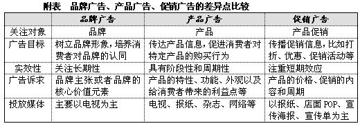 随着商品种类的日益繁多,消费者面临着越来越多的选择,于是广告成为了企业引导消费的重要营销手段。但是,随着生活节奏的加快和信息渠道的多元化,消费者能够记住的信息却越来越少,因此广告的影响力也在逐渐的减弱。 根据广告的目标,我们可以把广告分为品牌广告(或者形象广告)、产品广告和促销广告三类。品牌广告以品牌为中心,目标是树立品牌形象从而有助于长期销售,产生长远利润;产品广告和促销广告则主要以产品为中心,目标是引导消费者产生对产品的购买行为,产生特定时期的利润。很多企业每天都在不惜重金发布着这三类广告,或者单独投放,或者进行组合。但是这三类广告不论是在广告的实效性、广告的创意、广告诉求的角度,还是选择投放的媒体等方面都存在一定程度的差异,因此企业在操作的时候,又需要加以区别对待。