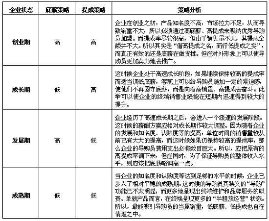 提成标准一般会根据所销产品的价格和推销的难易程度来定。有按件计提的,有按金额计提的。但不论如何,最终的货币体现一般为200—500元,超出500元以上的“暴发状态”则通常发生在个别淡旺季明显的产品上。 对于上述一些淡旺季明显的产品如空调、热水器、保暖内衣、皮装等,提成与底薪的比例一般会有较大的浮动。在旺季时能轻松突破3:3,甚至可以高达5:3或6:3甚至更高。但一到淡季,这个比例便会降到1:3甚至更低。导购员一般都仅靠底薪来维持与“东家”的合作关系。这在客观上就使得许多导购员像候鸟一样“淡去旺留”。这往往是许多厂商深感头疼的问题。 【利弊分析】 1、导购员底薪是导购员生活的基本保证,底薪过高、提成过低会导致导购员安于现状、不思上进;底薪过低、提成过高会造成导购员自身不保、冲劲不足。 2、如果导购员提成在同类品牌中无竞争力,就如同产品无竞争力一样,得不到导购员的积极推荐,很难有量上的突破,满足不了优秀导购员的对销售量的追求,留不住优秀导购人材。 3、高底薪只能暂时先把人才吸引过来,高提成能对导购员形成较大的奋斗激励。 4、但是高底薪使一些导购员抱有 多卖不多拿、少卖不少拿、不卖也照拿 的想法,多劳多得的良性激励方式得不到体现,极大地影响了导购员的销售积极主动性。 【相应对策】 按企业生命周期中的4个发展阶段采取不同的薪酬方案策略:
