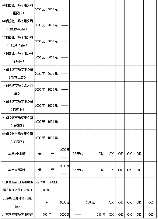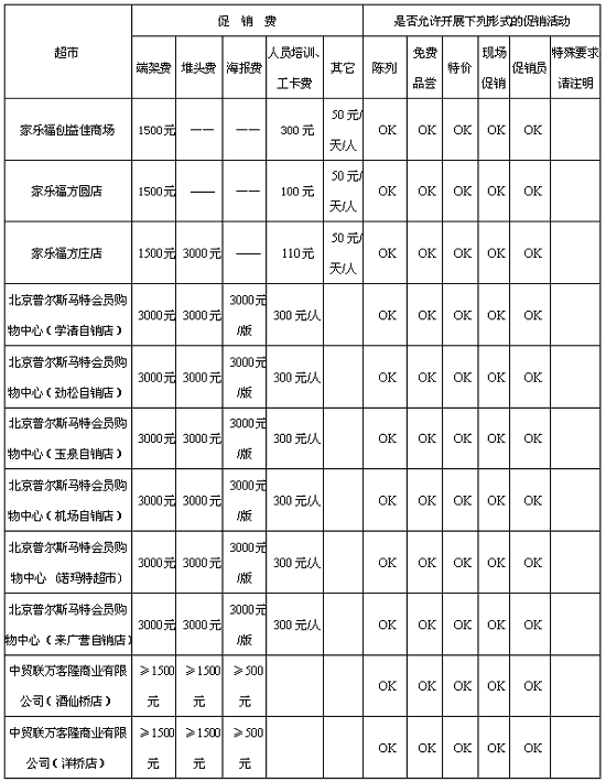 在制定工作流程图后,我们还针对每一次具体的促销活动制定详尽的促销计划并制成相关的表格进行规范。具体的促销计划不仅对促销量进行了预估,还可根据各终端的不同情况对促销形式、时间和费用作更具体的安排,使整个促销队伍既分工明确又协调一致。 招数二:知己知彼,有备无患 厂商在进行超市终端促销时,应当充分了解竞争对手的策略,从而调整自己的战术,做到知己知彼,百战不殆。同时,作为终端促销的载体,超市的政策也会为品牌促销带来一定的机会和威胁,如果能在开展活动前对目标市场有一个详细的调查研究,就能使厂商在做促销时游刃有余,达到既有效又经济的目的。 为使促销活动能达到最大的投入产出比,我们对北京各大销售终端的促销资源进行了详细的调查,包括各北京各大超市卖场的详细情况(此部分内容较多,本文限于篇幅,未从著作中摘出),可用于做促销的地方,可做促销的形式及各种促销费用进行了详细的归纳和研究,以便每次促销时能根据自己的促销目标作出相应的抉择。 下表是从《白叶品牌闪电制胜中国市场全程实录》中摘出的北京部分超市卖场促销相关费用,当然根据时期或厂商的不同,各项费用可能有所不同,这里列出此表供读者参考。 各超市卖场促销方式及费用表
