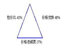 因为,影响消费者心目中的价格形象并不只有单纯的低价格(即价格优势),而且还需要综合考虑产品的性价比和价格诚实度。价格优势(Price Advantage)是产品的绝对价格,通常是相同产品价格的比较。性价比(Price Quality)指的是消费者所购买的产品是否物有所值或者物超所值。价格诚实度(Price Honest)是指产品在价格方面是否诚实可信,是否用低价格吸引消费者,结果发现特价产品已经完了。据调查表明,中国消费者对企业产品价格形象的三种因素的权重如下:性价比43%,价格优势40%,价格忠诚度17%。如图所示。