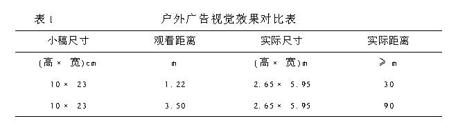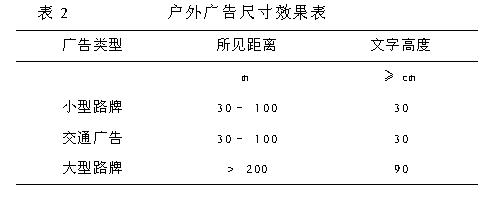 即把10×23cm的小稿放在1.22m观看的效果近似于30m外观看2.65×5.95m的广告效果。而文字尺寸的确定,如表2: