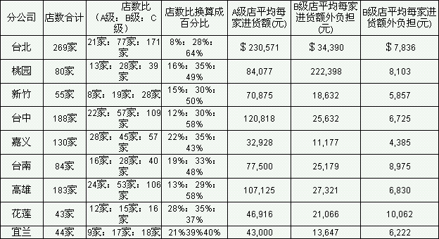 家数多,但每家客户的进货金额太少,形成表面上家数比的结构不错,但经营效率不经济,如(附表二)的嘉义分公司。所以,也要算出A级客户、B级客户、C级客户的“平均每家客户进货金额”,不可三者都低得离谱。