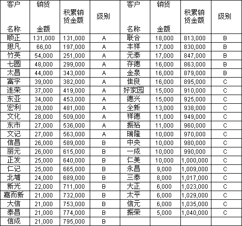 (四)在理论上,最标准的型态是:“A级客户:B级客户:C级客户”的金额比=“A级客户:B级客户:C级客户”的家数比