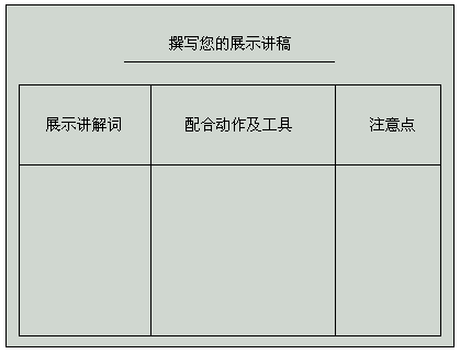 附言:写下您的展示讲稿 (注:本文摘自《盖登管理训练系列丛书·业务代表推销技巧指引》 《销售与市场》2000年第十一期, 作者: 黎守明、吴宏文 |