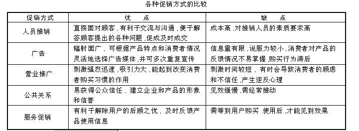 促销方式包括人员推销和非人员推销两种,后者又包括广告、营业推广和公共关系三种具体形式,还可以包括服务促销方式。两种促销方式各有特点:人员推销传播面窄、费用大,但信息可以双向传播,意见可以直接反馈,有利于买卖双方直接交流;非人员推销传播面广、速度快,但它属于信息的单向沟通,意见不能直接反馈,只能间接反馈。