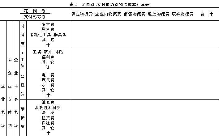 图中第一部分:物流成本横向管理方法; 第二部分:物流成本纵向管理方法; 第三部分:计算机管理系统。图反映出三个部分间的关系,计算机管理系统将物流成本的横向、纵向连接起来,形成一个不断优化的物流系统的循环。 通过一次次循环、计算、评价,整个物流系统在不断地优化,最终找出其总成本最低的最佳方案。 2.1 物流成本横向管理方法 (1)物流成本预测和计划 物流成本预测是在编制物流计划以前进行的。它是在对本年度物流成本进行分析,充分挖掘降低物流成本的潜力,寻求降低物流成本的有关技术经济措施,以保证物流成本计划的先进性和可靠性。 物流成本有月度计划、季度计划、年度计划和短期计划(半年或一年)、中期计划(三年)、长期计划(五年或十年)等计划体系。 (2)物流成本计算 物流成本计算的步骤: 第一步:把握范围别、支付形态别成本。参见表1。