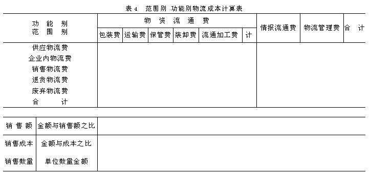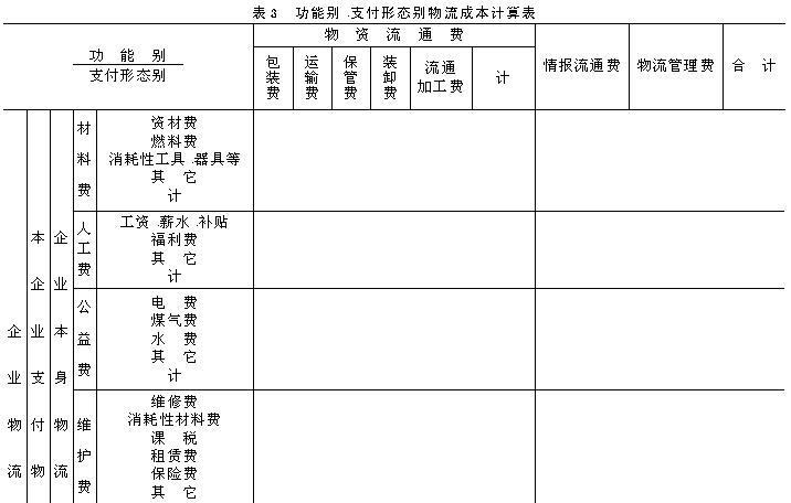 例如,物流范围别成本,仅以企业内物流费和销售物流费为对象,而支付形态别只取一部分计算,那么,只要把这一部分数据填入表内,其它栏目可空出。 第二步:把表1的费用按功能别分类,然后汇总。这时可以利用表2。 该表是将运输费、保管费等每一种功能各制一张表,如果把所有功能都作为计算对象时,则要编制若干张表。 第三步:如果想了解功能别支付形态物流成本的支出情况,可以把表2右端合计栏中的数字转入表3。 从表3中即可简单地看出哪种物流功能的成本最高,及其费用使用情况。 第四步:如果想求范围别、功能别物流成本,则把表1最下端物流数据转入表4。 从表4中,就能看出哪个范围别、哪种功能的物流成本高,同时还能计算出销售额与销售量得出的单位物流成本。要注意的是,每进行一次物流成本计算,都要明确一下计算范围。 (3)物流成本控制 物流成本控制有狭义和广义两种理解。狭义的物流成本控制,就是在企业的物流活动中,对日常的物流成本支出,采取各种方法进行严格的控制和管理,使物流成本节减到最低限度,以达到预期的物流成本目标。广义的物流成本控制,则包括事前、事中和事后对物流成本进行预测、计划、计算、分析的全过程,也就是物流成本管理。实质上都是对物流成本的控制。 物流成本控制的基本内容: ①运输费用控制。物资运输费用是承运单位向客户提供运输劳务所耗费的费用。运输费用物流费用比重较大,据日本通产省对六大类货物物流成本的调查结果表明,运输成本占总物流成本的40%左右,是影响物流费用的重要因素。 控制方式有:加强运输的经济核算;防止运输过程中的差错事故;做到安全运输等。 ②储存费用的控制。储存费用是指物资在储存过程中所需要的费用。 控制方式:主要是加强仓储各种费用的核算和管理。 ③装卸搬运费用的控制。装卸搬运活动是衔接物流各环节活动正常进行的关键,它渗透到物流的各个领域。装卸搬运费是物资在装卸搬运过程中所支出费用的总和。 控制方式有:对装卸搬运设备的合理选择;防止机械设备的无效作业、合理规划装卸方式和装卸作业过程。如减少装卸次数、缩短操作距离、提高被装卸物资纯度等。 ④包装费用控制。包装起着保护产品、方便储运、促进销售的作用。据统计,包装费用约占全部物流费用的10%左右,有些商品特别是生活用品,包装费用高达50%。 控制方式有:选择包装材料时要进行经济分析;运用成本核算降低包装费用;如包装的回收和旧包装的再利用。实现包装尺寸的标准化、包装作业的机械化;有条件时组织散装物流等。 ⑤流通加工费用的控制。在物资进入流通领域以后,按照用户的要求进行一定的加工活动,称为流通加工,由此而支付的费用为流通加工费用。 控制方式有:合理确定流通加工的方式;合理确定加工能力;加强流通加工的生产管理;制定反映流通加工特征的经济指标。