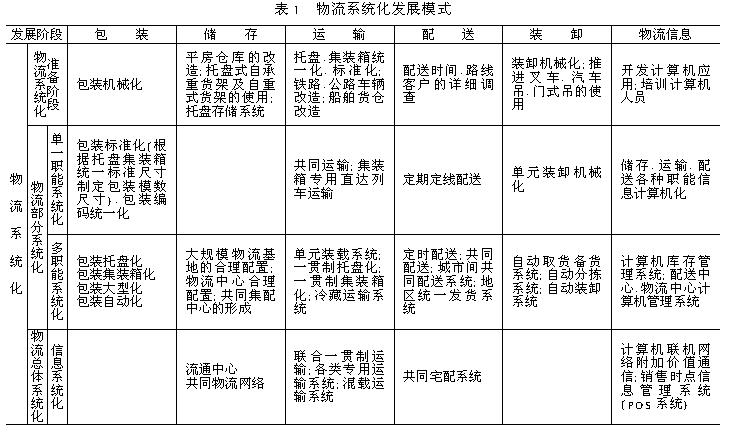 作为目标系统的现实可行的优化物流系统是找出现行系统的问题,按照约束条件提出现实可行的改进方法而形成的,可以说是归纳得到的。理想系统大多是演绎得到的。而且理想系统因人而异,所以混同目标系统和理想系统,物流系统化就不顺利,因此弄清物流系统化目标系统,找出物流系统化发展模式是非常重要的。 从物流系统化水平来看,我国要比日本、美国及西欧发达国家落后三十多年以上,因此,当这些国家物流系统化已经进入后勤化(logisticization)的现代,我们不能盲目提倡我国物流系统也要后勤化,事实上,我国在相当长的时期内还无法做到。需要的倒是根据我国物流系统化尚未展开的实际,大力借鉴这些国家的成功经验,制定符合我国国情切实可行的物流系统化发展模式,加速实现这个目标系统以缩短我国达到这些国家现有水平的进程。 物流系统化发展既受国家经济发展水平制约,又受物流系统化内在联系制约,其发展模式必须遵从这种制约,不能随心所欲。根据我国经济发展水平、物流系统化内在联系,我国物流系统化大体可采用如下模式(如表1)。