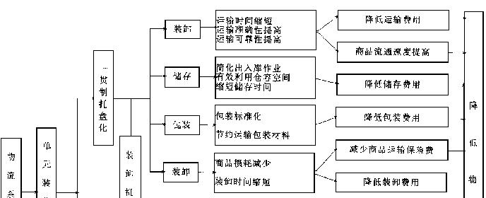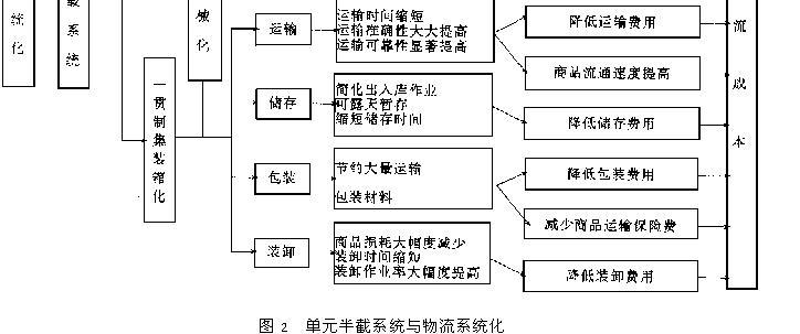 若将运输手段称为方式(Mode),把港口、货站这种运输手段换载的基地(仓库、流通中心,有时还包括工厂)称为结点(Node),把构成运输手段通路的铁路、公路、水路称为连线(Link),那么社会物流系统化可以说是完善连线,使结点与方式现代化,按照运输需求,从制度、运行、技术上有效利用方式的特性,选择最优方式进行组合。 社会物流系统化的方法有: (1)提高运输效率的方法。①联合一贯制运输,②集装箱直达列车运输,③共同运输,④定时配送。 (2)提高结点功能的方法。①复合终端,②流通中心,③配送中心,④流通加工基地,⑤自动化仓库。 (3)装卸合理化的方法。①集装箱化,②托盘化,③装卸机械化。 (4)提高信息功能的方法。使用电子计算机,并逐步形成计算机联机系统,实现信息系统化。 社会物流系统化是以物价稳定、资源合理配置和社会资金有效利用为目标的,而企业物流系统化则是维持企业生存、增加企业利润、强化企业竞争力为目标的。因此,社会物流系统的最优化与企业物流系统化有时会出现矛盾、对立。但当企业进行物流系统设计时,社会物流是作为必不可少的外部环境条件来考虑的,也是物流系统化的理想目标。 按照表1的物流系统化发展模式,我国社会物流系统化的首要任务是集中力量完成如下基础工作: (1)物流基础设施建设。包括连线的建设以及结点与方式的现代化。需要国家统一规划、统一布局综合运输网络和配送中心、物流中心及流通中心。 (2)制定统一的托盘尺寸,大力推进托盘化。没有这个基础工作就谈不上包装标准化,也谈不上装卸效率化基础上的物流系统化。 (3)研究开发我国的商品条形码和商品交易票据的标准化。这是最终实现物流系统化的信息系统化的基础,没有这个基础自然谈不上信息系统化,也就无法实现物流系统化。 完成以上三项基础工作可以说是我国物流系统化的第一步,这些基础工作需要耗费很大的力量才能完成,并且需要相当长的过程,有的甚至要用十年以上。只有扎扎实实地从全社会来推进这些基础工作,而不是任其自由发展,物流系统化才有希望,否则数年之后才认识到并着手这些基础工作,那就太晚了。 有计划地分步推进物流系统化发展模式,才能有效借鉴发达国家物流系统化经验,才能缩短我国物流系统化的进程。尤其需要全社会共同努力才能实现的是作为物流系统化进程两个重要标志的单元装载系统和信息系统化。 单元装载系统是物流系统化由某一职能系统化进入多职能系统化的标志。它的建立表明物流系统化达到多职能协调阶段,它涉及到运输、储存、包装、装卸、配送的全部设施、设备的系统化。因此,它是推进物流系统化的关键。单元装载系统与物流系统化的关系如图2所示。