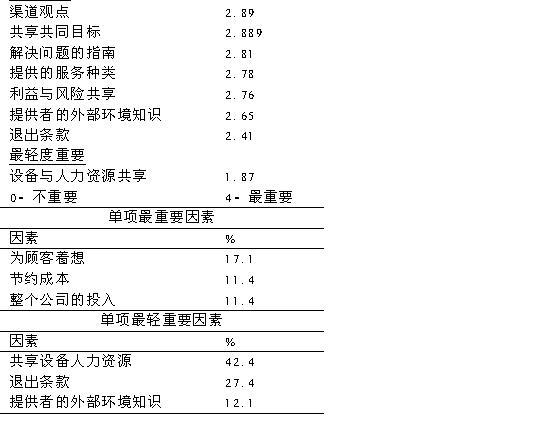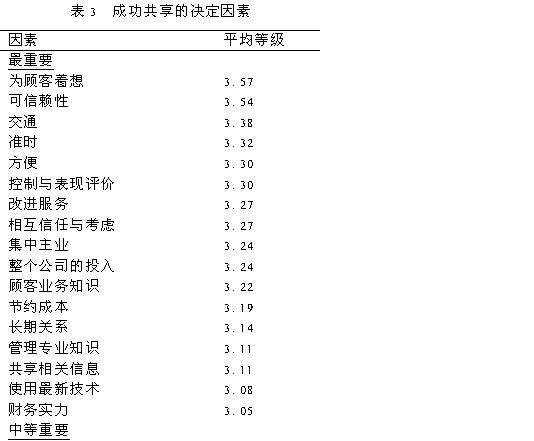 营运性质的信息见表2。根据文献,契约物流可分为有资产与无资产公司二类。有资产公司以自己的资产提供特定物流服务,无资产公司是管理公司,不拥有或租赁资产,它们提供人力资源和系统,专业管理顾客的物流功能。表2所示,有资产与无资产公司几乎各占一半。另外,第三方物流公司可以管理整个物流过程或有选择的几项活动。它们的确可以完成许多不同的任务,如报关、运价谈判、库存管理、承运人选择等近30种第三方物流服务项目。由表2可知,仅15%的公司提供10种以下,2/3强起码20种第三方物流服务,中位数是18种,证实第三方物流提供者能提供广泛的服务。表2还给出了最常(75%的公司)与最不常(25%公司)提供物流服务种类,75%公司提供10种服务,包括发展物流策略/系统、EDI能力、管理与营运报表。10种最常提供的服务包括一般的,如发展物流策略/系统,具体的,如货物集运、承运人选择、运费清算、运价谈判等四种服务。 表2最后又给出了四种少于25%公司提供的服务,包括信用证的校对、出口许可的帮助、国际通信和海外采购。 2.什么是第三方物流提供者认为比较重要的与顾客成功有关的因素? 研究结果与被选择公司及被调查者的经营特征是否有关?研究表明,代表契约物流,服务提供者与它们的客户之间成功关系有25个因素。 附录中列出了文献中经常提及的主要因素。根据下列等级评价25个因素的重要性:0=无重要性;1=稍微重要;3=中等重要;4=最重要。表3的结果清楚地表明,第三方物流提供者认为所有的因素起码对与顾客的成功业务关系是重要的。最低等级因素为1.87,属于轻微重要,其它7个因素等级在2.41至2.89的为中等重要。最后,17个因素等级为3.05至3.57的属于最重要。 表3说明,最重要的因素是顾客定位,这与经营哲学有关。顾客服务是一个导致服务交换增值的过程。它包括提供者对购买者的需求顾客化与定制的能力。第二重要因素是可信赖性。第三重要因素是提供者能适应不断变化的商业环境,提高应急能力。 被调查者要求指出最重要的与最不重要的因素。如表3,17.1%的公司为顾客着想是最重要的,11.4%的公司认为节约成本是最重要的。 40%的公司认为最不重要的因素是共享人力与设备等。