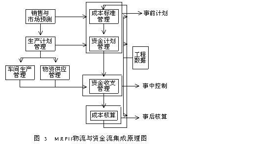 分析了企业生产过程中物流与资金流的关系;阐述了物流及资金流的闭环均衡控制在企业经营管理中的重要意义;针对现有MRPI系统中对资金流管理方面的不足,探讨了MRPI中资金流与物流管理进一步集成,以实现MRPI系统对资金流与物流的全面管理的方法,并开发了原型系统. 1 问题的提出 面对日益严峻的市场竞争,生产企业为了以最低的成本、最短的制造周期、最好的质量,生产出顾客满意的产品来赢得竞争,不得不改变现有的管理模式.采用现代化的管理手段,提高人力、物力、财力等制造资源的利用效率是企业面临的新课题.MRPII正是企业进行现代化管理的科学方法之一.随着信息技术的不断发展,越来越多的企业运用了以计算机技术为基础的MRPII系统,我国的MRPII系统的研究、开发、应用也在不断地深入. 资金流和物流是企业经营管理的主要对象.在物流管理方面,MRPII系统通过销售管理、主生产计划、粗能力计划、物料需求计划、细能力计划、车间管理、采购管理等功能,逐步实现了对物流管理的闭环控制;在资金流管理方面,MRPII包含了应收应付帐管理、成本会计核算等功能,这些功能使财务核算所需的资金费用信息直接来源于生产计划的执行,减少了资金费用信息的重复录入工作,提高了信息的准确度和集成度.但是,分析MRPII系统的资金流管理功能,不难发现,MRPII系统中资金流的管理功能主要是对资金的事后核算,是对企业已经发生的生产经营活动中资金流的客观反映和监督.现有的MRPII系统中,资金流的管理并没有实现与物流管理一样的事前计划、事中控制、事后核算的全面控制过程. 从企业的角度看,随着我国市场经济发展,资金管理尤为重要,越来越多的企业管理者和决策者希望能及时追踪和分析企业的支出、成本、收益的来源.MRPII系统中原有的对资金流的事后核算功能已经不能满足企业的需求,因此必须扩充MRPII系统中的资金管理功能,使MRPII系统不仅能够实现对物流的闭环控制,而且能够实现对资金流的闭环控制. 2 系统分析 2、1物流与资金流的关系 企业的生产过程是给物资赋予劳动、知识和信息,改变其形状、功能或性质的过程,也是资金的投入与增值的过程,是物流与资金流相互转化、相互作用、相互统一的辨证统一过程.物资运动是资金运动的基础,物资运动决定着资金运动,物资运动状况的正常与否,决定着资金运动状况的好坏;资金运动也反映着物资运动,并对物资运动具有积极的影响作用.通过对资金运动是否通畅的分析,可以观察企业供、产、销等活动是否正常的进行,并可根据存在的问题,采取相应的措施,使资金运动与物资运动相结合,从而提高生产经营的效益.资金运动和物资运动相互结合的关系,体现了制造工业企业再生产过程的实物形态和价值形态的必然联系. 首先,资金处于货币资金的状态.企业用一部分货币资金去购买原材料等劳动对象.当购买发生后,这部分资金从货币形态转化为储备资金.然后,把原材料等劳动对象投入生产过程.在对劳动对象的加工过程中,这部分资金与另一部分支付给劳动者的报酬和其他生产费用结合在一起,组成生产资金.当产品加工完毕,这部分生产过程的资金又转化为成品资金.到产品销售并取得货款后,资金又由成品资金转化为货币资金.收回的货币资金,一部分用于补偿生产消耗,在下一期生产经营活动中,再从事购买材料,开支费用;一部分以税收形式上缴国家财政;余下的留作各种基金,用于发展生产等方面的需要.在整个过程中,物流由原材料到零部件、到成品,不断的变换着物料的性能;而资金则由货币形态转化为实物形态,再由实物形态转化为货币形态,不断循环往复,完成资金的增值过程.物流与资金流的关系如图1所示.