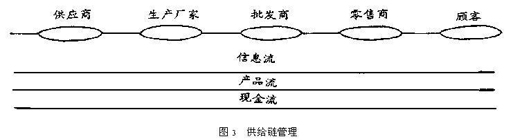 第二阶段:综合物流管理阶段(Integrated Logistics Management) 到了70和80年代,企业越来越认识到把物料管理与实体分配结合起来管理(见图2),可以大大地提高效益。70年代后期,美国首先进行了运输自由化,承运人和货主能自由定价,服务的地理范围也可以扩大了,承运人与货主建立紧密与长期的合作,增加了企业系统分析物流,降低成本和改进服务的可能;同时全球性竞争加剧,使采用新的物流管理技术、改进物流系统成为必要。如零库存(JIT)、全面质量管理(TQM)等方法,大大地改进了物流系统管理。 第三阶段:供给链管理阶段(Supply Chain Management) 到了80和90年代,由于一系列外部因素变化,企业开始把着眼点放开至物流活动的整个过程,包括原材料的供应商和制成品的分销商。这就形成了所谓的供给链的概念(图3)。这一概念同时又基于制造商与供应商、分销商及物流公司的合伙及联盟(partnership/alliances)的趋势。要实现供给链的概念不是一件容易的事,因为它涉及到不同的利益单位。对总体供给链最优的方案,对个别供给链成员可能其短期利益并不是最优的。虽然这样,供给链方法从节省成本与提高服务水平的观点来看,具有很大的潜力。