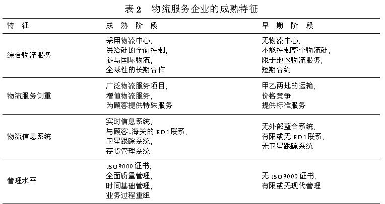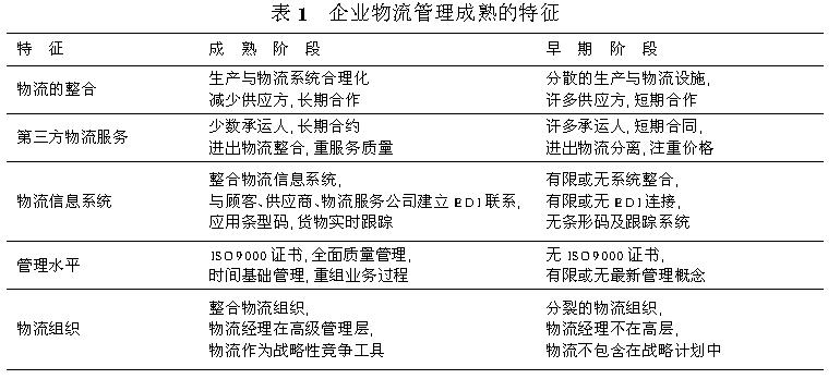 随着企业物流管理的发展,原先提供运输服务的物流企业,也相应地扩大了它们的服务范围,开始出现了所谓第三方物流业(ThirdPartyLogistics),提供综合物流服务,第三方物流业是货主和运输业之外的第三者从事物流服务的企业,运输业发展物流服务部分也是由于运输自由化导致运输企业的激烈竞争所迫使。第三方物流业也可以是运输代理业、仓储业等其他与物流服务相关的行业发展而来。 物流管理与物流业的发展,在发达国家也是不平衡的,一些企业物流管理已取得了较高的水平;另一些企业则还处于早期阶段。企业的物流管理水平和物流服务企业的成熟与否,可用表1和表2分别表示。