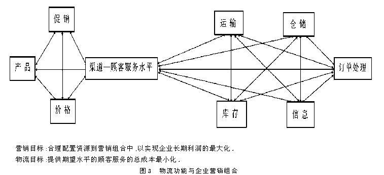 ●通过减少库存,降低仓储成本,也许会降低顾客服务标准或增加缺货成本。 ●提高交货速度会增加顾客服务水平,但使运输成本上升以至需更高的总成本。 ●达到较低运输成本的考虑导致库存的增加与顾客服务的减少。 受产业活动全球化、市场成长和渠道数量等方面的影响,物流行为变得更加繁杂,物流成本要素的权衡固然重要,也只是企业整体经营系统的一部分,而每个企业也只是供应链的一个成员。明确这一点,会使企业在制定经营战略时更为理智与富有成效。 3.企业经营对物流的依赖性增强 3.1 物流对企业营销组合的影响 企业营销的产品、价格、促销和渠道策略以及其它策略的有机组合,是在竞争中开拓市场,实现价值优势的重要决策。物流管理技术能力在很大程度上左右着营销组合的系统制定与实施,各项功能相互牵连,交织成网(见图3)。