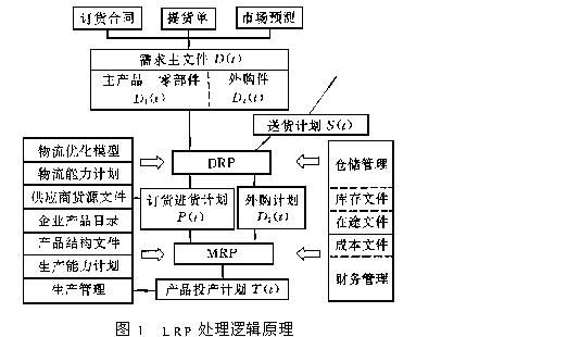 由图 1可以看出 ,它输入社会需求主文件、产品结构文件、生产能力文件、物流能力文件、生产成本文件和供应商货源文件等 ,形成产品投产计划、生产能力需求计划、送货计划和订货进货计划、运输计划、物流能力需求计划等 ,并进行成本核算 .而社会需求主文件 (即社会订货 )总是先由 DRP从库存中予以供应 ,仓库中不够的再向MRP订货进货 .与一般 MRP不同之处在于 ,这里的 MRP的输入是 DRP生成的订货进货计划P(t)的一部分 ,即向生产部门的订货 ,其输出除了一般 MRP生成的产品投产计划 T(t)之外 ,还加上了向 DRP输入的外购计划 D3 (t) . MRP根据 DRP的生产订货进货计划进行 MRP处理 ,制定生产任务单、产生加工任务单交生产部门加工 ,外购件又加入 DRP系统的需求文件 ,进入 DRP处理 . DRP仍然先从仓库供应 ,仓库不够的由订货进货计划到资源市场去采购进货。 具体实施时可以分成以下三步 : 步骤 1 将主需求计划 D(t)中本企业能够生产的主产品和零部件 (根据企业产品目录确定 ) D1 (t)单独运行 DRP,得出需向企业生产部门的订货进货计划 P1 (t) .其中内部主需求计划D1 (t)是主需求文件 D(t)中的一部分 ,即企业能够生产的一部分 .这一部分在 DRP处理时 ,总是先由仓库库存中供应 ,当库存下降到安全库存量时 ,再向生产部门发出订货。 这时 ,各参数按如下公式确定 : Q(t) =Q(t-1 ) -D1 (t) ; P (t) =Q0 ; P1 (t) =P (t-t P) . 式中 ,Q(t)为本期期末库存量 ;Q(t-1 )为上期期末库存量 ;Q0 (t)为订货批量 ;P (t)为本期计划到货量 ;t P为订货提前期 . 步骤 2 由生产订货计划 P1 (t)运行 MRP求出产品投产计划 T(t)及其零部件外购计划D3 (t) . 步骤 3 将主需求文件 D(t)中的非本企业能生产的部分 D2 (t)和由 MRP得出的外购部分D3 (t)再输入 DRP运行 ,得出从市场的订货进货计划 P(t)和送货计划 S(t) .其中 ,在途物资分为送货在途到货 OS(t)和进货在途到货 (入库 )OP(t) . Q(t)用下式计算 : Q(t) =Q(t-1 ) -D2 (t) -D3 (t) + OS(t) +OP(t) . P (t)是这样确定的 :当 Q(t)下降到订货点(或安全库存量以下 ) ,就要安排一个到货 ,其大小等于一个订货批量 Q0 ,即P (t) =Q0 . 而订货进货计划 P(t) =P (t-t P) . 送货计划 S(t)为 S(t-t S) =D(t) ,式中 t S为送货提前期 . 通过这三步就得到了订货进货计划、采购计划、投产计划和送货计划 .实际上如果输入物流能力条件 (仓储运输条件等 )、物流优化模型、成本文件 ,还可以得到物流能力计划、统一运输方案和物流成本。 3、LRP的应用