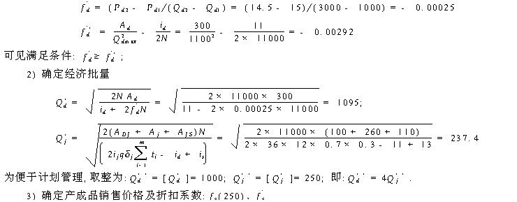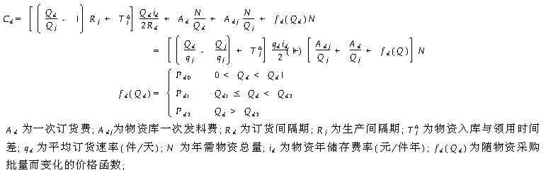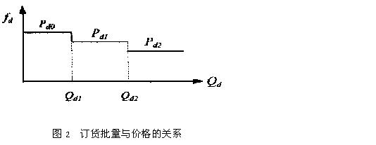 3、生产系统批量与费用分析 物资订货环节批量费用分析设年物资批量费用为Cd,则Cd包括:订货费、购置费、储存费、发料费等组成.在具有批量价格折扣的条件下,价格一般呈阶梯型变化(见图2.)综合各费用因素,可得物资订货及储存环节年费用算式(1);