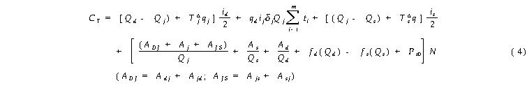 3. 4 生产系统批量费用综合分析 从生产系统整体考虑 ,物流批量总费用包括上述三个环节费用 ,即 :CT=Cd+Cj+Cs.综合式 (1 )、(2 )、(3 ),并设 q=qd=qj=qs,得系统批量总费用计算式 (4).