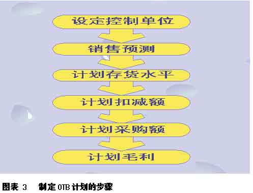 OTB计划的制定 那么,我们应当怎么制定自己的OTB计划呢? 首先,企业要做好自己企业的商品需求的预测和预算,这个主要是对于采购和门店的金额的控制。整个OTB计划的核心其实就是对于金额的控制。如何使企业的采购成本有效,高效。而对于采购金额的控制就意味着要计划和监控整个零售企业的存货的投资。这一点在目前的有些省份的大型连锁企业已经在进行计划使用,因为一个成熟的连锁零售企业的采购系统将会逐步摆脱商品的代销制度,逐步延边为商品的帐期采购模式。这样的方式不仅有利于零售企业对于自己的库存的合理调配,更有利于供应商的生产水平的提高。连锁零售企业在制定OTB计划的步骤是这样的(如图3): 在我们日常的连锁零售管理中管理控制单位(control units)中可以分为常分为部门,大类,中分类,小分类四个级别。设定控制单位将关系到自己将来采购管理的精细化程度,例如:如果我们在日常管理中只是知道某一个部门的销售额比去年同时期上升了20%,但是不知道某些中分类或者小分类的情况的变化,那样将对于我们的日常的品类管理会产生一些麻烦,尤其是一些商品品种比较多的门店,分析销售数据更是一个相对比较困难的事情。但是我们也应当根据自己的门店和企业的自身实力来决定企业的控制单位。例如,一家连锁零售企业拥有100家门店,他的管理控制单位是到中分类,而自己的中分类共有100个,那么它每个OTB的计划周期将要处理100×100即10000张采购计划,这个数据量对于一般的连锁零售企业是没有办法完成了,这也就形成了原本是为了管理方便,反而将自己的日常管理困在了数据之中,岂不舍本求末了,所以这一个步骤将会影响到我们的OTB的工作量。在美国,最广泛的世界分类只是划分到部门,但是根据目前的国内连锁零售行业的发展情况和计算机软件和硬件行业的发展,建议能管理到中分类,这样就可以是企业的管理者评价每一个中分类商品或者采购员业绩情况。