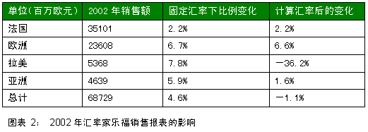 汇率的影响对家乐福的影响到底有多大 而从另外一个角度来看,在伊拉克战争之后,美元出现的持续的走低以及欧元汇率的不断上扬,导致一些与美元汇率的关联汇率的国家产生了巨大的影响,而就在2002年,家乐福的经营就曾经饱受汇率波动的影响,虽然其销售额在固定汇率的计算下是上升了4.6%,呈现增长的态势,但是当年的汇率影响达到了-5.7,进而在实际换算后,销售额下滑了1.1个百分点。 回忆2002年1月1日,阿根廷比索与美元的汇率为0.994,即1美元兑换0.994阿根廷比索,仅仅半个月以后,阿根廷比索就已经下跌到1:1.90的情况,即下跌了将近50%,而这一个下跌的趋势没有得到有效的遏制,还在不断的下跌,2月最低到了1:2.15,3月份最低下降到了1:3.60,进入5月份以后,阿根廷比索的汇率就没有在下过1:3.01 ,全年最低达到了1:3.8800,而最高汇率就是年初放开与美元的固定汇率的前几日,全年平均1:3.11049,2002年12月31日的阿根廷比索的汇率为1:3.390 。正是因为这样的大幅度的货币汇率变动,把家乐福的阿根廷市场也带入风雨飘摇的动荡时期。下图表2是家乐福2002年汇率对销售报表影响的表格,可以看到其销售影响程度。拉美地区在固定汇率下,销售上升7.8%,而在换算汇率之后,家乐福拉美地区的实际销售额却是下滑了-36.2%,这个影响不可不说影响巨大。