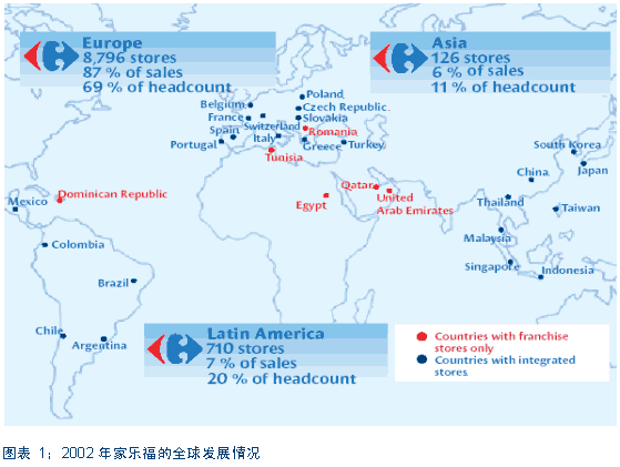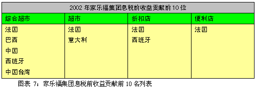 图表7,我们可以看到2002年家乐福息税前收益的前10位中综合超市占领了半壁江山,同时也可以发现中国仅次于法国,巴西而成为家乐福在2002年中的销售重点之一。