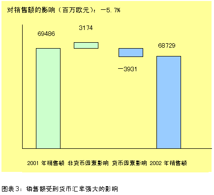 同时,由于阿根廷比索汇率的变化,对于周边的拉美国家也都产生了重大的影响。巴西币的汇率在2002年1月1日的汇率为1:2.40630,即1美元折合2.40630巴西币,年底12月31日汇率下跌至1:3.54250,全年平均汇率为2.96705,最低下跌到1:4.000的状态。从而,我们就会看到下面图表3:2002与2003年家乐福销售额在货币汇率影响下的销售统计变动情况。
