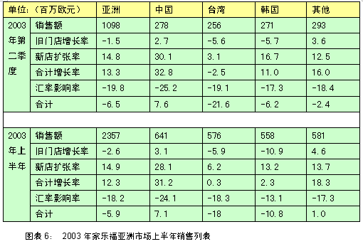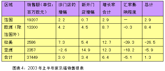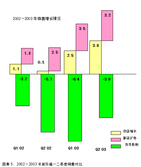 虽然,在2003年上半年的报表中,我们发现除了欧洲和法国本土市场外,其他地区的销售都因为某些问题而呈现出销售下滑的现状,但是这些对于2003年这个风雨中飘摇的国际零售巨头要比去年的日子好过了许多啊…… 图表5是2002~2003年家乐福一二季度的销售增长率的变化情况,虽然第一季度的销售比去年增长了不少,但是汇率的变化让这个增长变成了-0.4%,而在2003年二季度销售情况仍在保持着一定的比率上升,同时由于汇率影响减少,使得家乐福集团整体的销售终于“阴雨转晴天”了,露出了一丝丝笑容。
